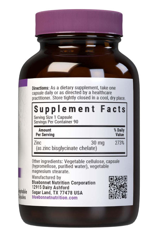 Bluebonnet's Albion Chelated Zinc Capsules provide 30 mg of elemental zinc from fully reacted zinc bisglycinate, an amino acid chelate mineral from Albion. Available in an easy-to-swallow vegetable capsules for maximum assimilation and absorption.