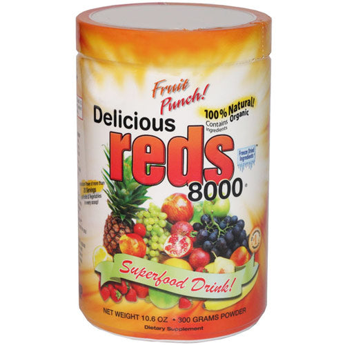 Eating your fruits has never been easier thanks to Delicious Reds 8000. A super fruit powder drink with virtually every berry known to man. Wild blue berries, raspberries, black berries, bilberries, goji berries, cherries, cranberries and strawberries.....the list just keeps going on and on! Then, to kick it up a bit, we added hints kiwi and citrus fruits for added punch and taste. Delicious Reds 8000 is made with dozens of ingredients including certified organic fruits and vegetables, enzymes, probiotics, natural fibers, vitamins minerals and more.