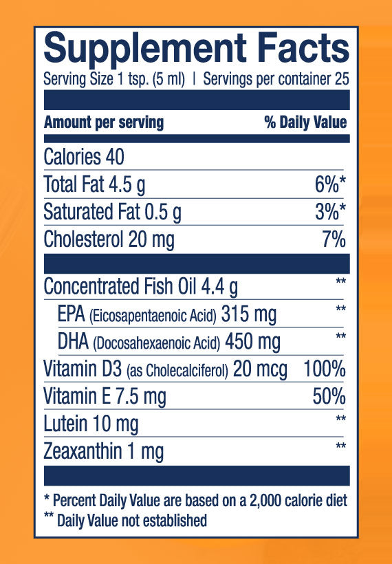 - 315 mg EPA, 450 mg DHA Omega-3 + Lutein, Vitamin D3 and E.