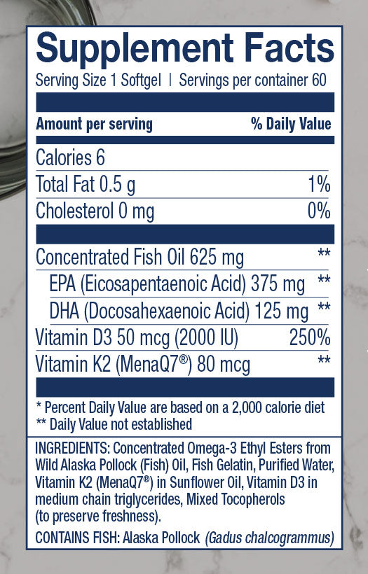 Concentrated Omega-3 Ethyl Esters from Wild Alaska Pollock (Fish) Oil, Fish Gelatin, Purified Water, Vitamin K2 (MenaQ7) in Sunflower Oil, Vitamin D3 in medium chain triglycerides, Mixed Tocopherols (to preserve freshness).