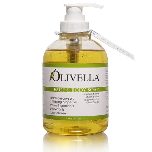 Olivella liquid soap is an innovative product formulated with 100% virgin olive oil which allows it to hydrate the skin as it cleanses, without leaving an oily residue. No other liquid vegetable soap provides such high concentrations of vitamins, essential fatty acids, and natural antioxidants that are present in Virgin Olive Oil. Olivella liquid soap contains no animal fats, no harsh man-made chemicals, and no dyes or color additives. This gentle face and body soap is suitable for every age group and skin type-even babies.