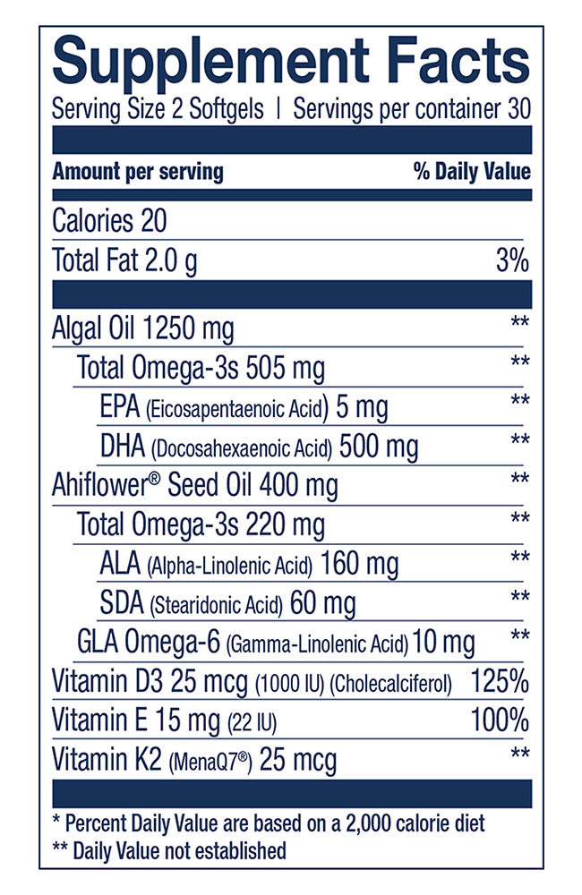 Algal Oil (marine algal oil [Schizochytrium sp.] natural triglyceride), Ahiflower Oil (ahiflower seed oil [Buglossoides arvensis] natural triglyceride), Natural Antioxidant Blend of (Rosemary Extract, Non-GMO Mixed Tocopherols, Sunflower Lecithin, & Ascorbyl Palmitate), Non-GMO Vitamin E (Sunflower), Natural Vitamin K2 (MenaQ7) in sunflower oil, Vitashine Vitamin D3 (Lichen in Coconut Oil). Softgel Capsule (Non-GMO modified corn starch, palm glycerin, carrageenan, sorbitol, and purified water).