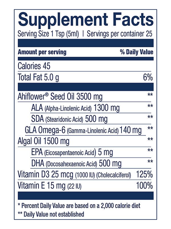 Ahiflower Oil (ahiflower seed oil [Buglossoides arvensis] natural triglyceride), Algal Oil (marine algae oil [Schizochytrium sp.] natural triglyceride), Natural Antioxidant Blend of (Rosemary Extract, Non-GMO Mixed Tocopherols, Sunflower Lecithin, & Ascorbyl Palmitate), Natural Flavors, Non-GMO Vitamin E (Sunflower), Vitashine Vitamin D3 (Lichen in Coconut Oil).