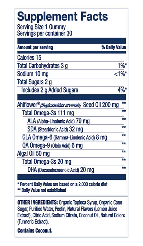 Ahiflower (Buglossoides arvensis) Seed Oil, Algal Oil, Organic Tapioca Syrup, Organic Cane Sugar, Purified Water, Pectin, Natural Flavors (Lemon Juice Extract), Citric Acid, Sodium