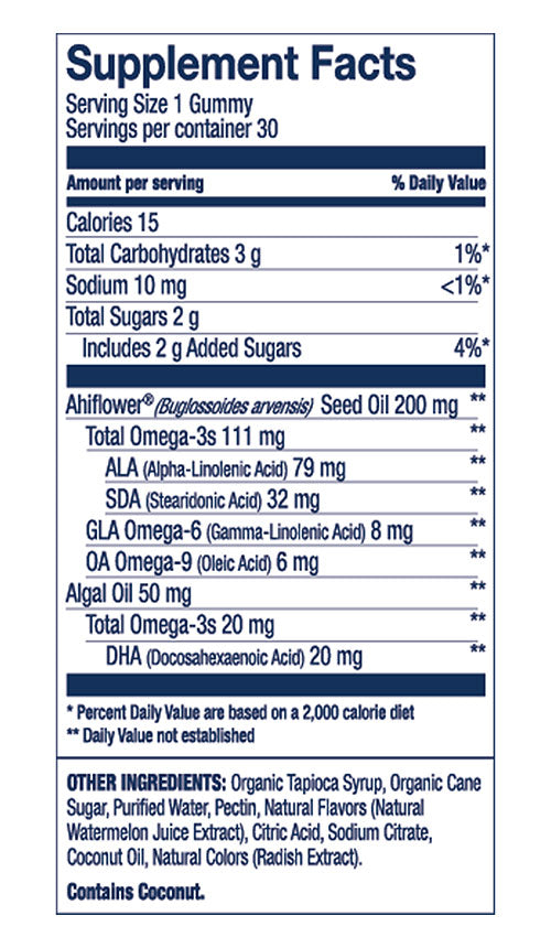 Ahiflower (Buglossoides arvensis) Seed Oil, Algal Oil, Organic Tapioca Syrup, Organic Cane Sugar, Purified Water, Pectin, Natural Flavors (Watermelon Juice Extract), Citric Acid, Sodium Citrate, Coconut Oil, Natural Colors (Turmeric Extract).