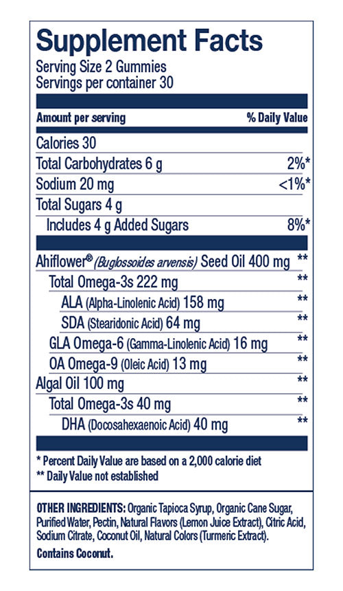 Ahiflower (Buglossoides arvensis) Seed Oil, Algal Oil, Organic Tapioca Syrup, Organic Cane Sugar, Purified Water, Pectin, Natural Flavors (Lemon Juice Extract), Citric Acid, Sodium