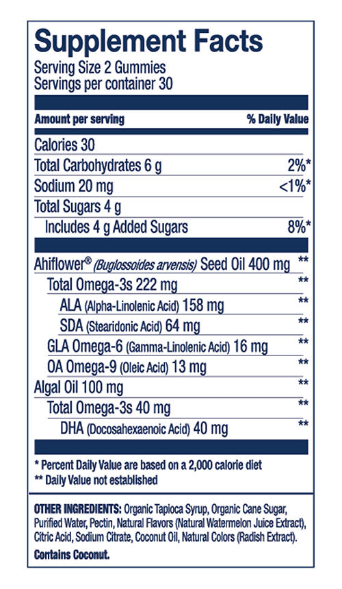 Ahiflower (Buglossoides arvensis) Seed Oil, Algal Oil, Organic Tapioca Syrup, Organic Cane Sugar, Purified Water, Pectin, Natural Flavors (Watermelon Juice Extract), Citric Acid, Sodium Citrate, Coconut Oil, Natural Colors (Turmeric Extract).