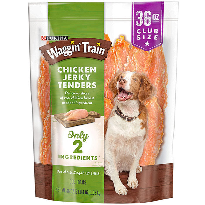 Show your dog how much you care! Purina Waggin' Train Chicken Jerky Tenders adult dog treats give your furry- riend the simple goodness he needs for maintaining his health and well-being. You won't have to feel guilty about giving your dog a snack when you choose these chicken jerky dog treats because they do not contain any corn or grains.
