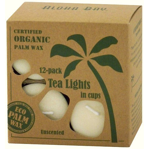 EcoCert certified 100% organic Eco Palm Wax tea lights. Sourced from sustainable and socially responsible palm groves in South America. Each box contains 12 tea lights in aluminum cups.