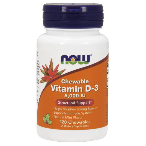 NOW® Chewable Vitamin D-5000 supplies this key vitamin in a tasty chewable form. Vitamin D is normally obtained from the diet or produced by the skin from the ultraviolet energy of the sun. However, it is not abundant in food. As more people avoid sun exposure, Vitamin D supplementation becomes even more necessary to ensure that your body receives an adequate supply.