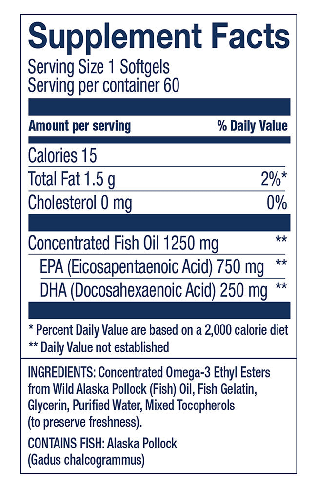 - Each softgel contains 750mg EPA, 250mg DHA for a total of 1000mg EPA + DHA.