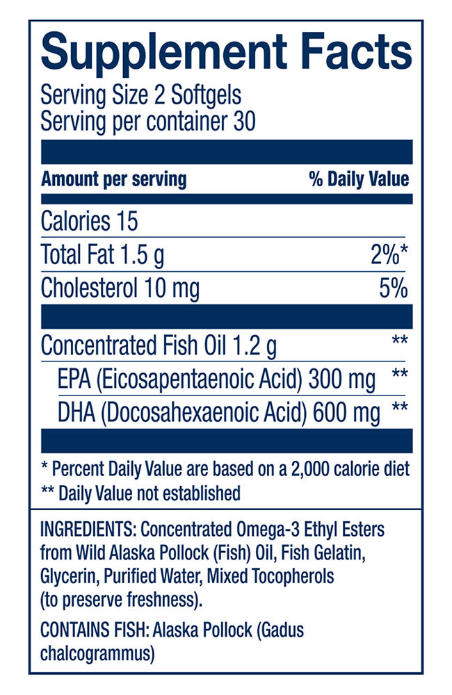 - Each serving contains 300mg EPA, 600mg DHA for a total of 900mg EPA + DHA Omega-3s.